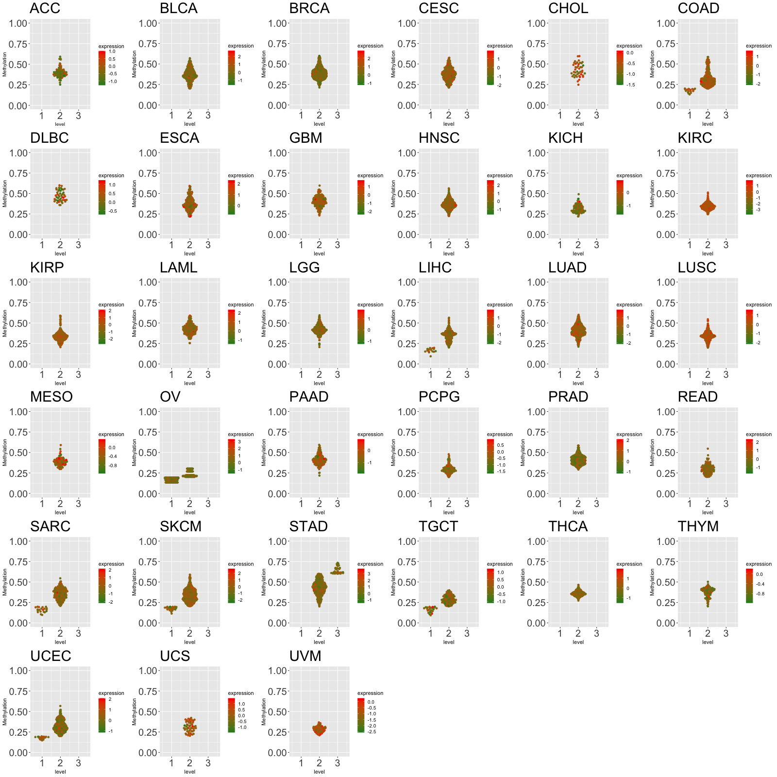 | Cancer type | Gene | methyl group b | methyl group a | DEG pval | avg methyl in b | avg methyl in a | avg exp in b | avg exp in a |