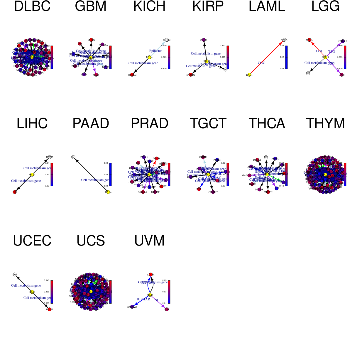 Strongly correlated genes belong to cellular important gene groups with RPL24 (coefficient>0.8, pval<0.05, node color based on FC between tumor and matched normal). Significantly associated important genes in the individual cancer types. * Cell metabolism gene: cell metabolism genes from REACTOME (black edge), IUPHAR: drug target genes from IUPHAR (blue edge), Kinase: human kinase genes (brown edge), CGC: cancer gene census genes (orange edge), TSG: tumor suppresor genes (purple edge), Epifactor: epigenetic factors (light blue edge), TF: transcription factors (green) |