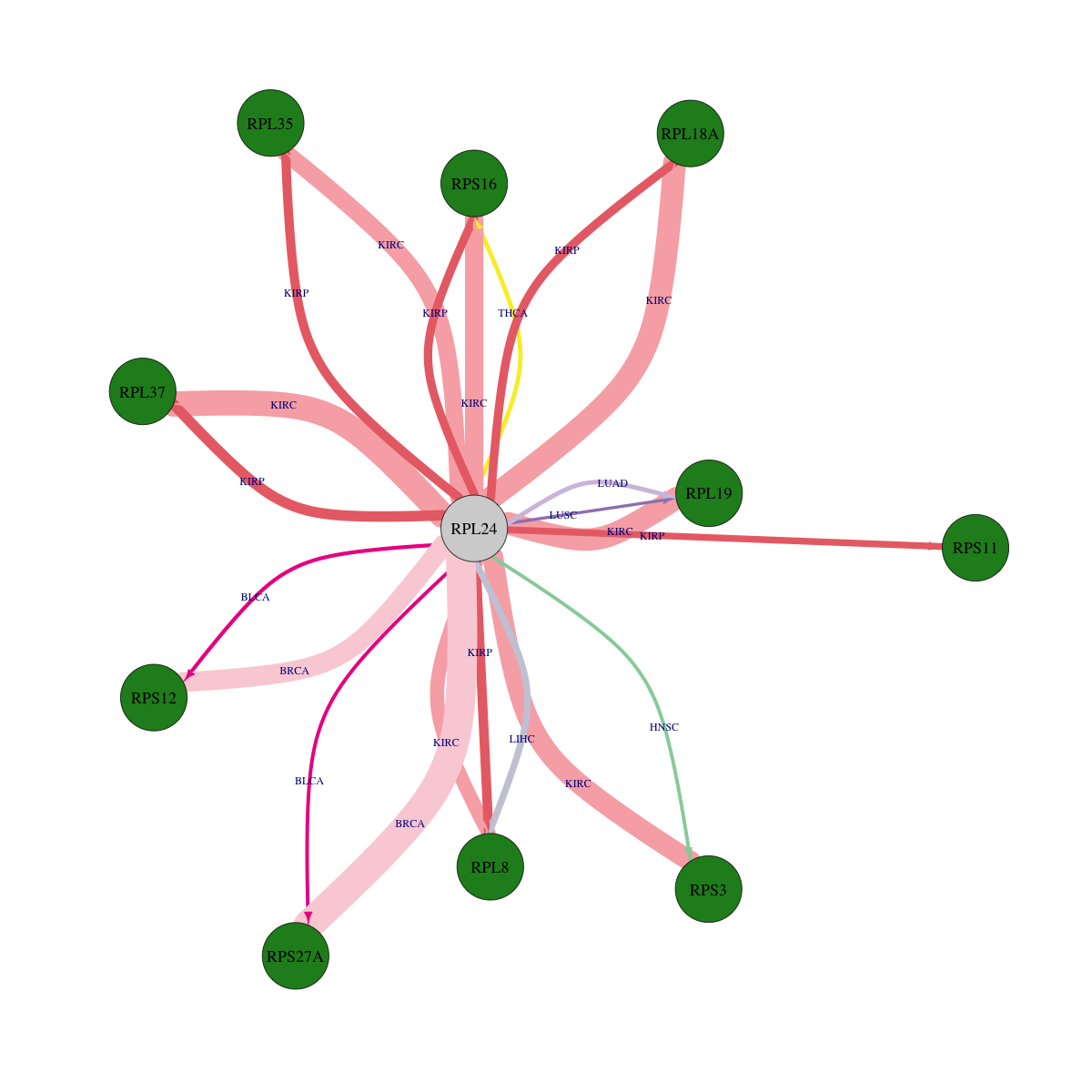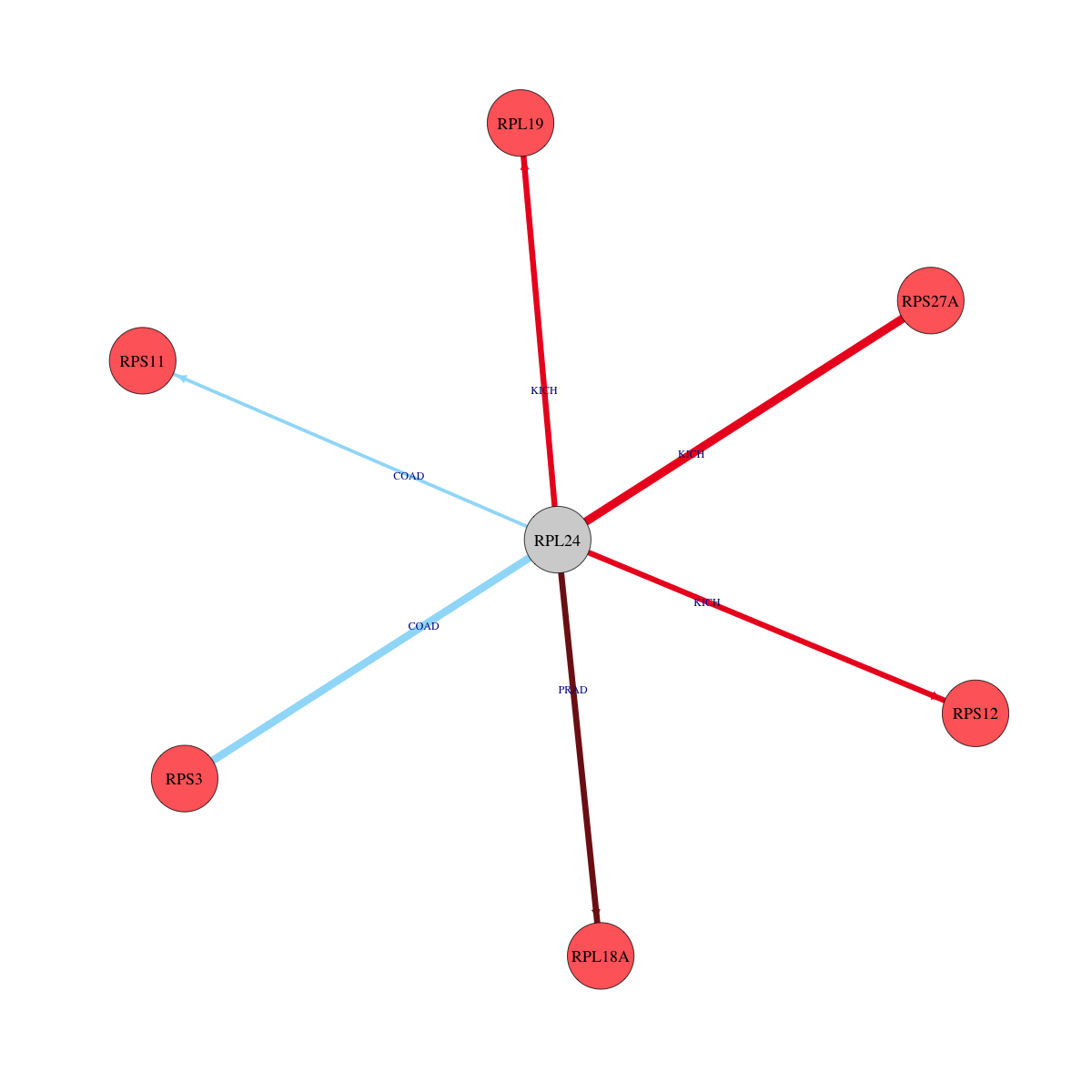 | KIRP | RPL24 | RPL37 | -1.17421621947139 | 2.26888805627823e-05 |